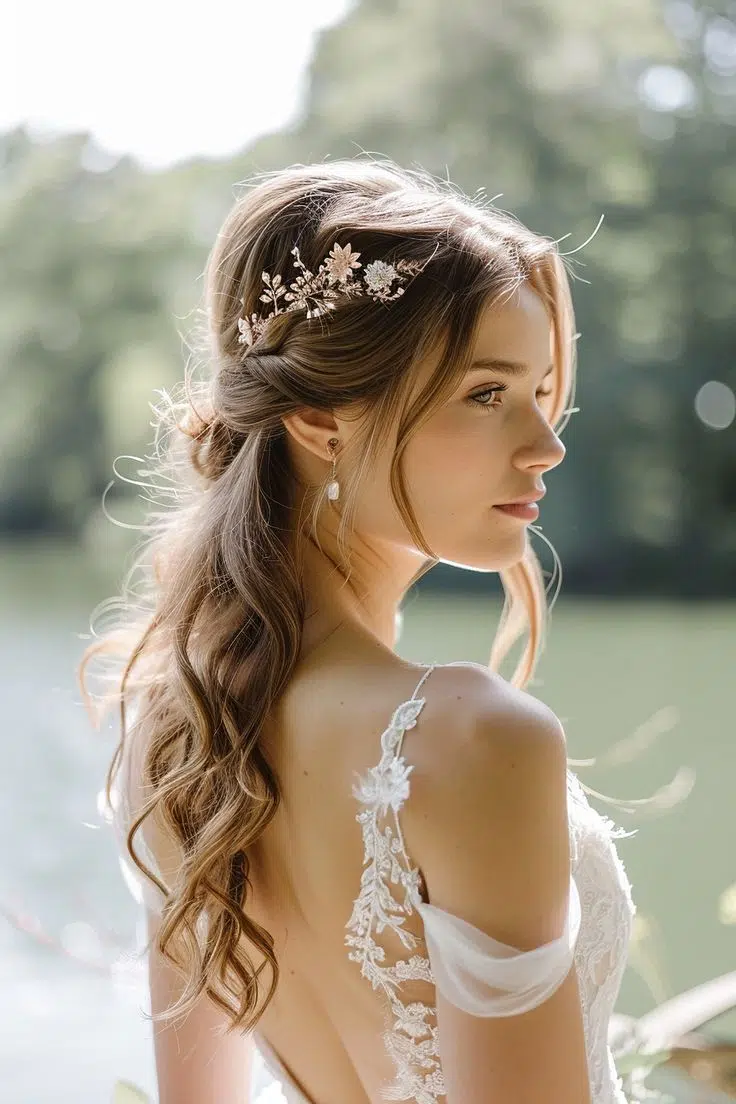 ولو مش قادرة تقرري بین الشعر المنسدل أو الشعر المرفوع، عندك دایمًا خیار تسریحات عرایس نصف مرفوعة ونصف منسدلة. والتسریحة دي ھتخلیكي تحققي التوازن بین الشكلین.